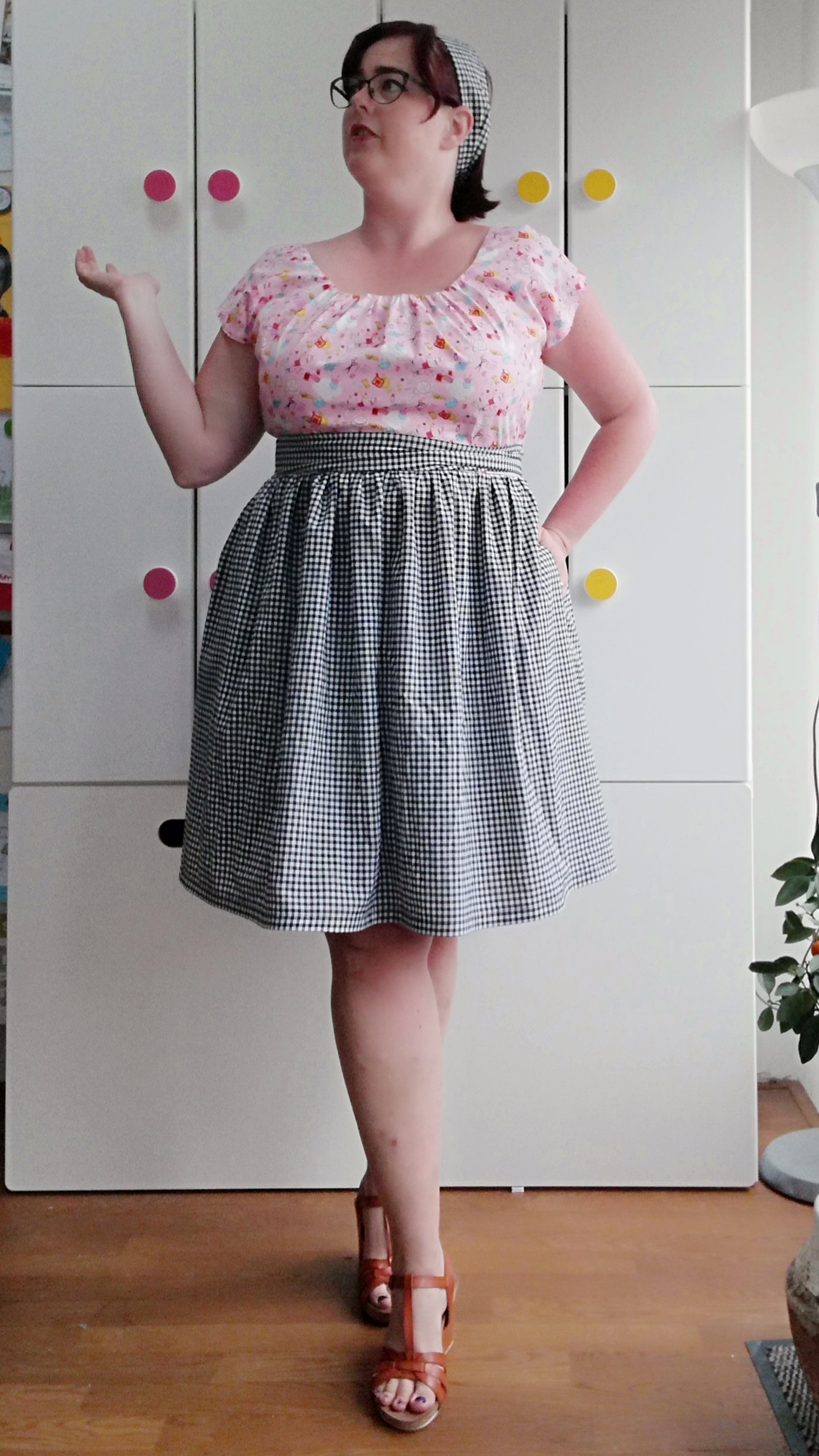 Tot slot besloot ik van het restje oranje stof en een beetje van het biaisband een zak te maken (want, zakken), maar deze keer een beetje anders dan anders. In plaats van onzichtbare zakken in de zijnaden, besloot ik dat bij deze rok juist een opgestikte zak goed zou passen. Dus op het laatste moment (tegen de middag van 5 mei) tekende ik een zak, perste er plooien in, en werkte hem af met hetzelfde biaisband dat ik voor de zoom gebruikte.